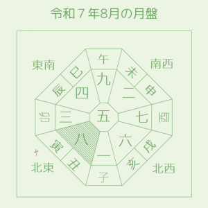 2025年8月は甲申(きのえさる)の月で五黄土星が中央に在座しています。
