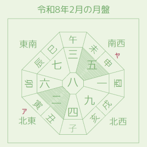 2026年2月は庚寅(かのえとら)の月で、中央に在座しているのは八白土星です。