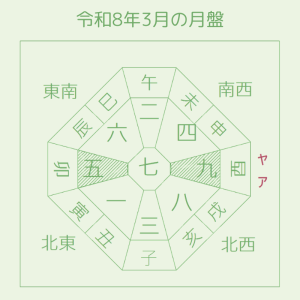 2026年3月は辛卯(かのとう)の月で、中央に在座しているのは七赤金星です。